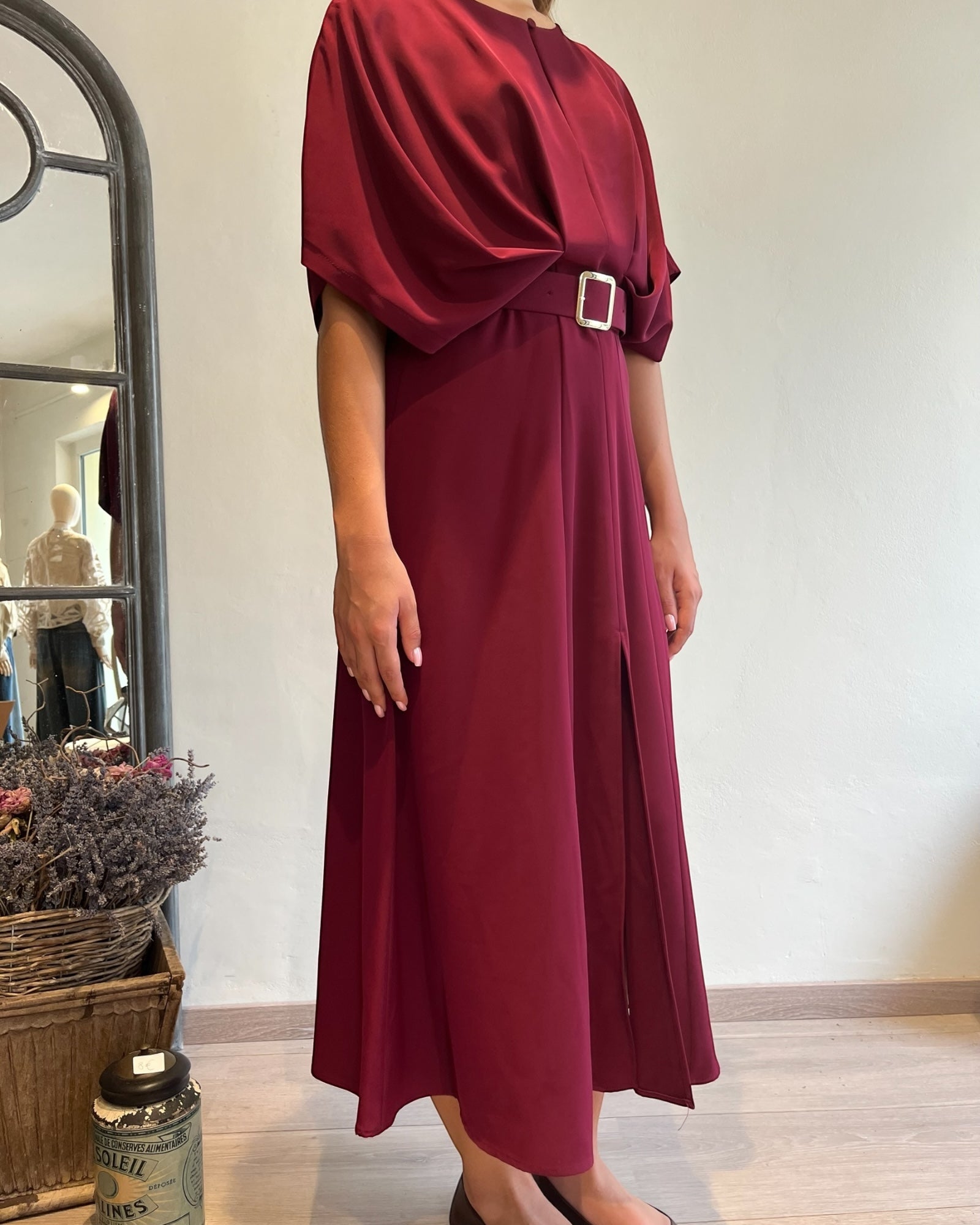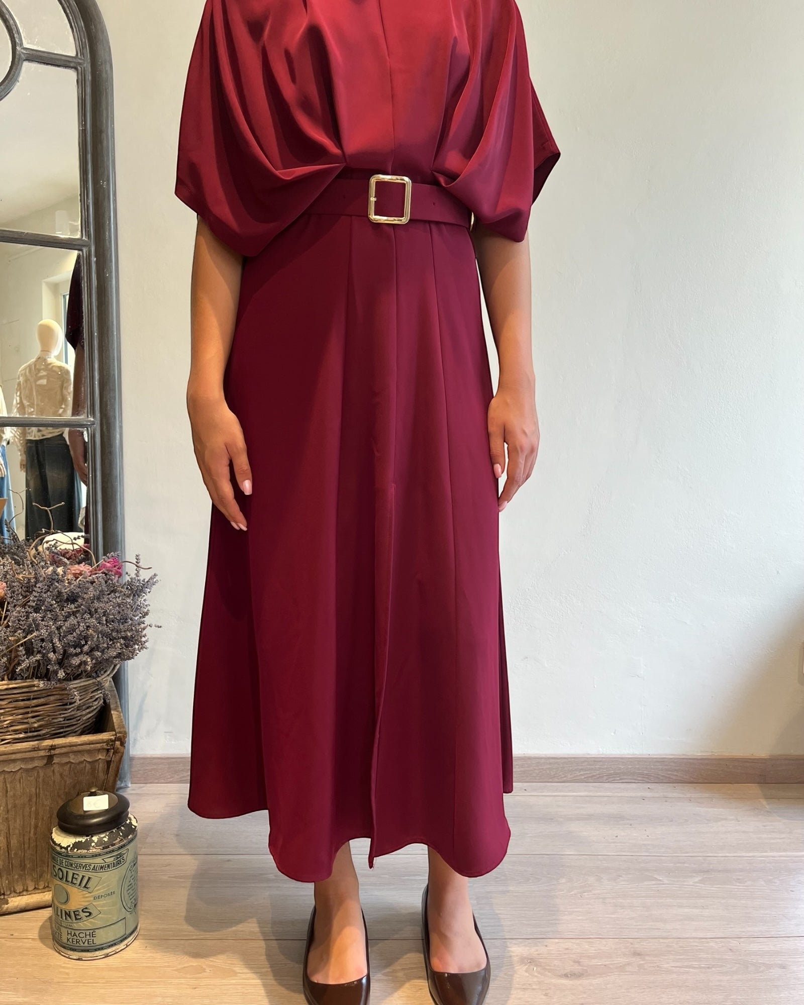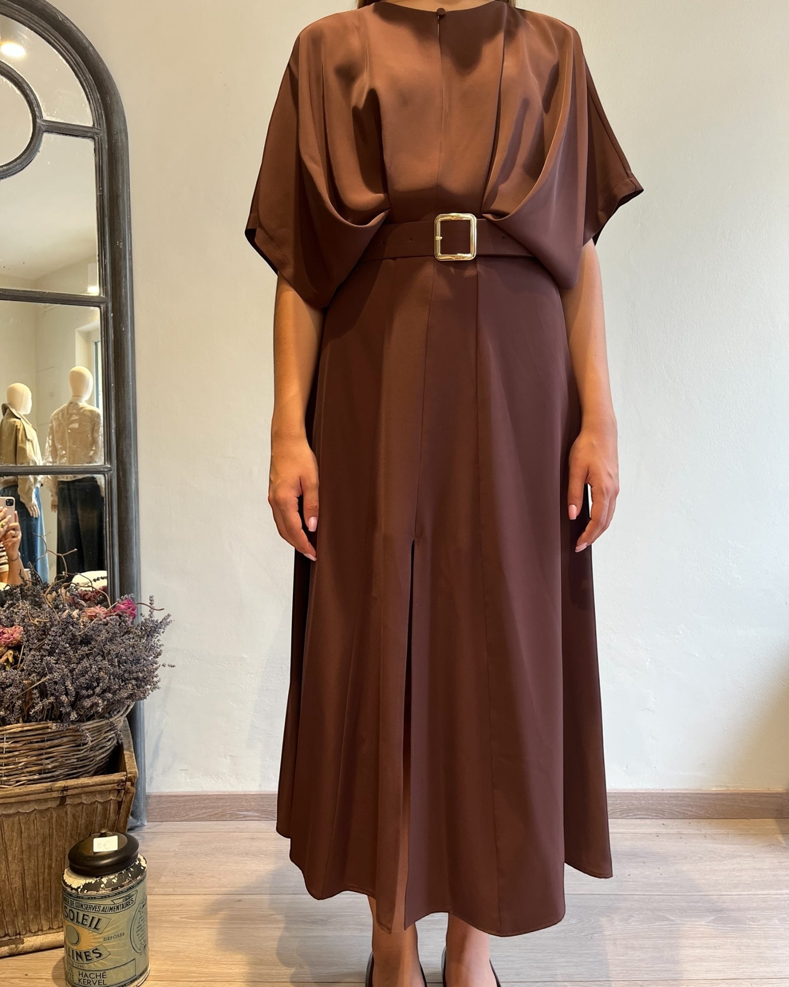 Abito midi dal taglio fluido con cintura in vita che valorizza la silhouette.