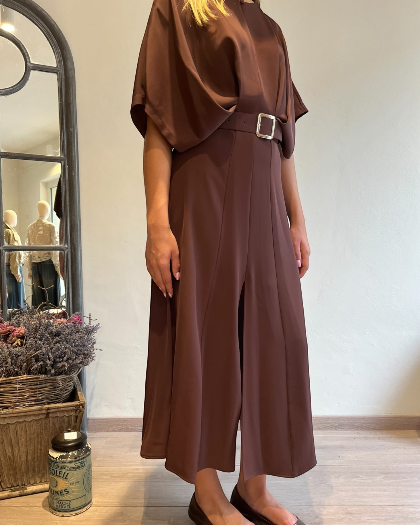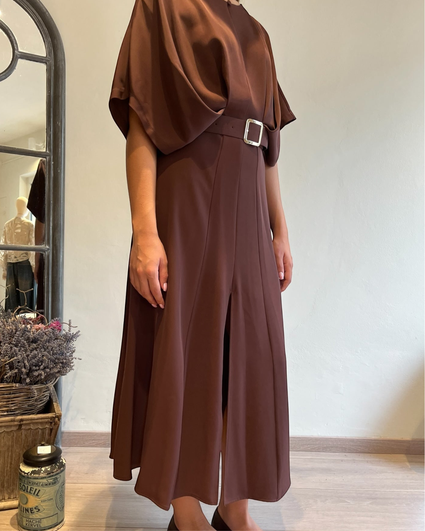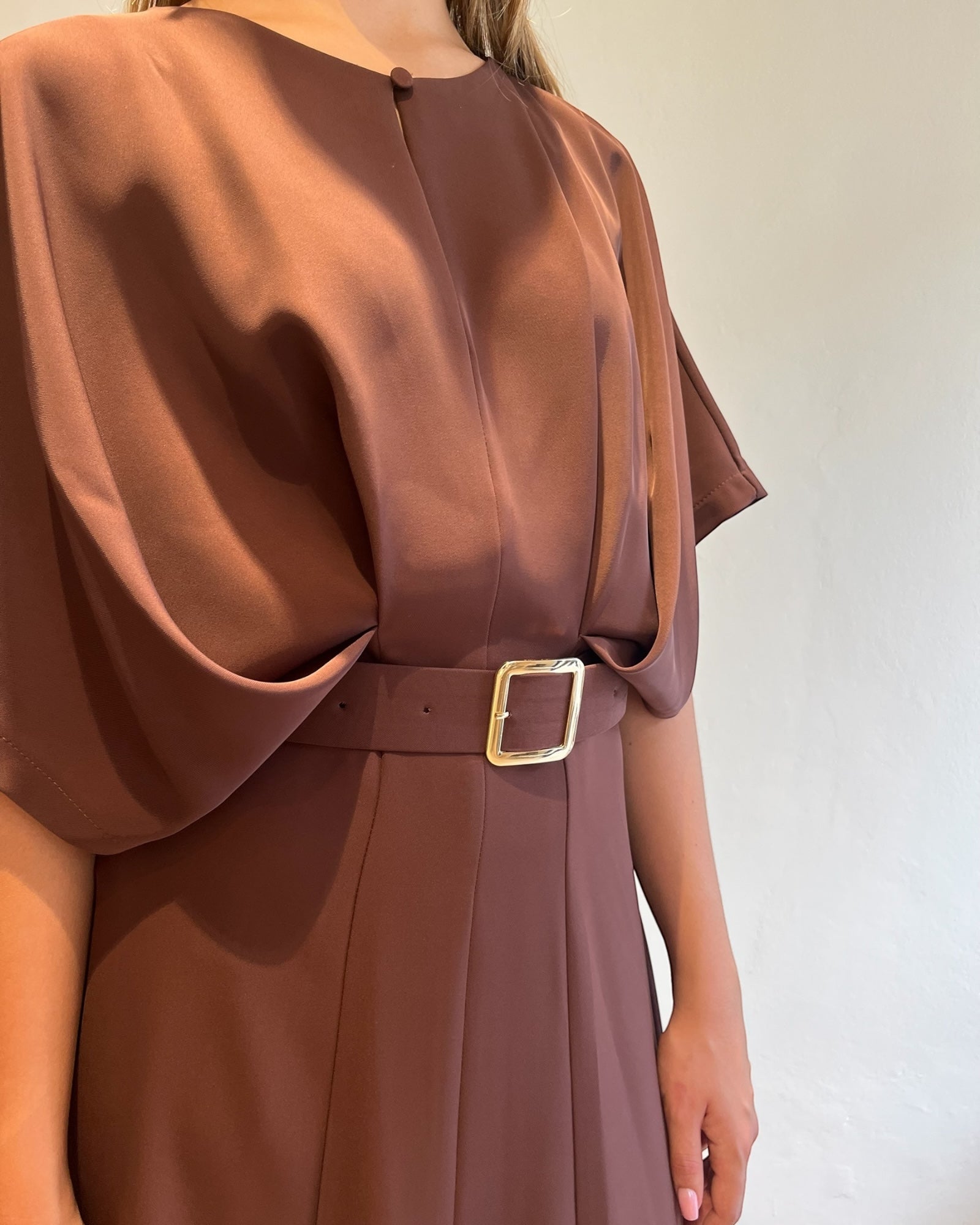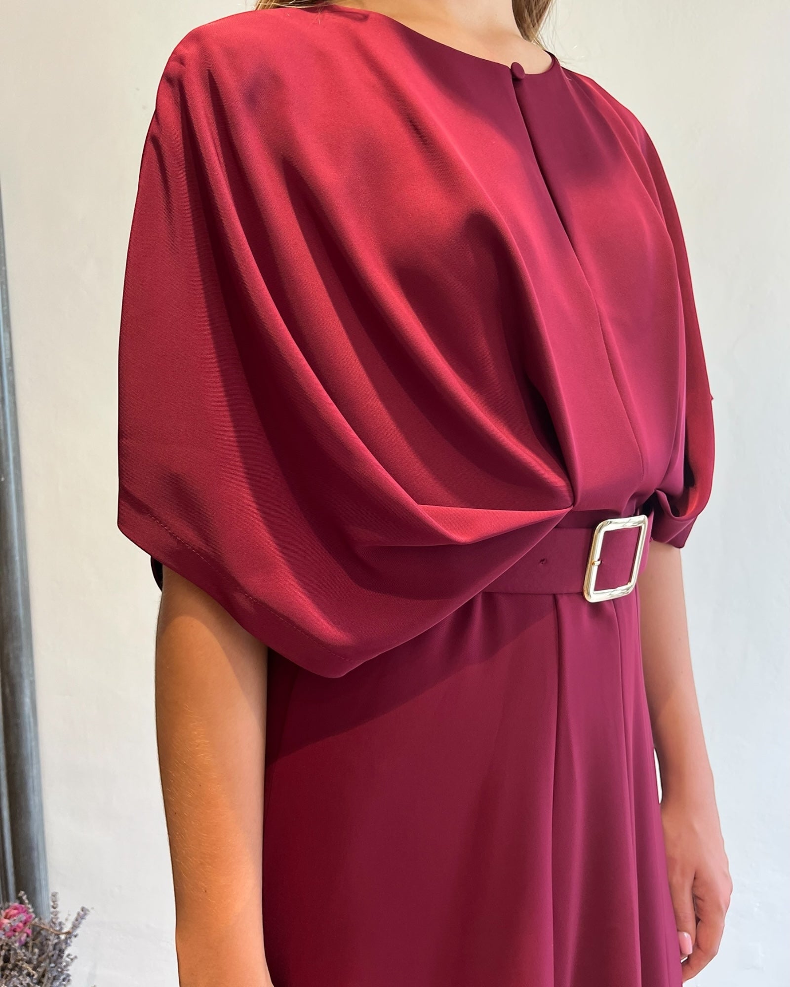 Abito midi dal taglio fluido con cintura in vita che valorizza la silhouette.