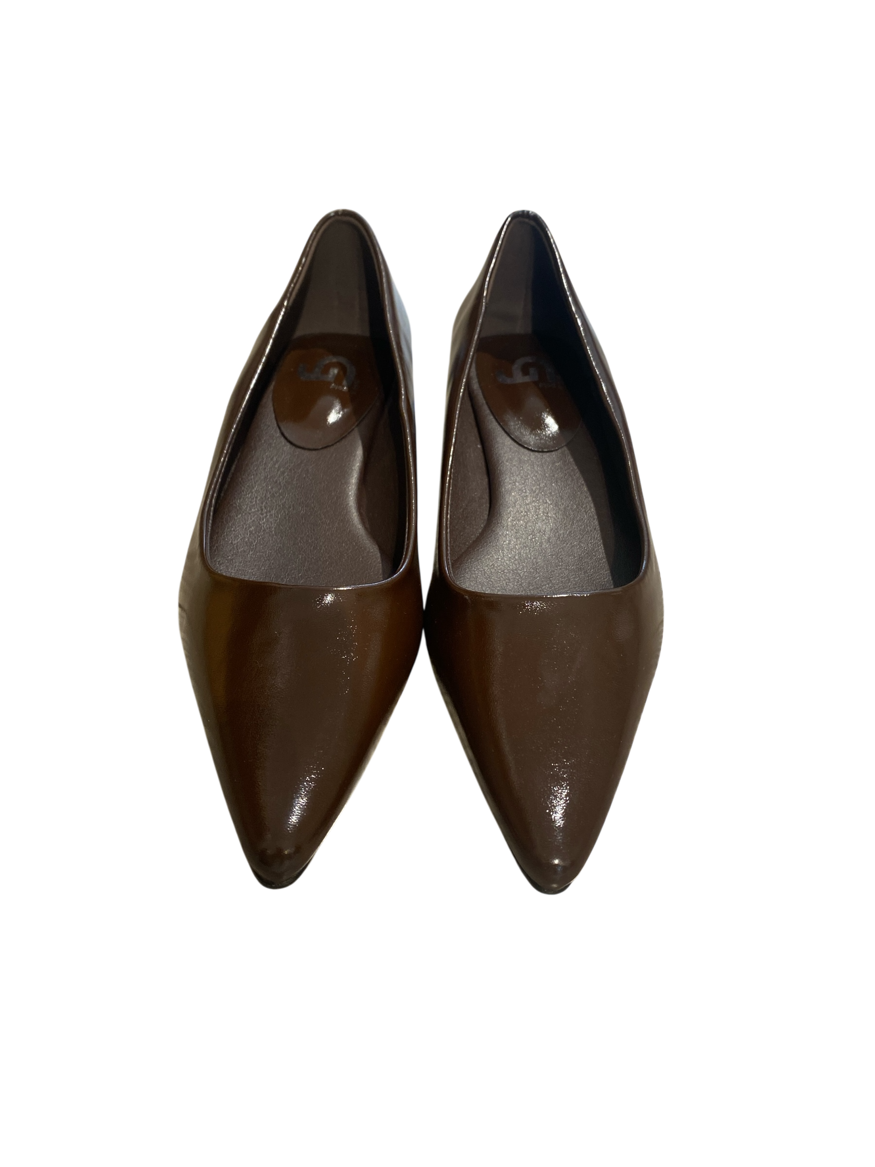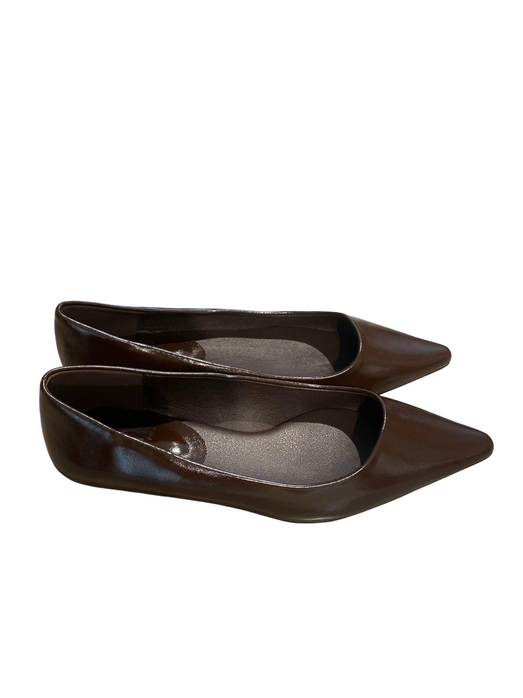 Ballerina a punta con finitura lucida, realizzata in ecopelle e completata da un sottopiede in vera pelle per garantire comfort e praticità.