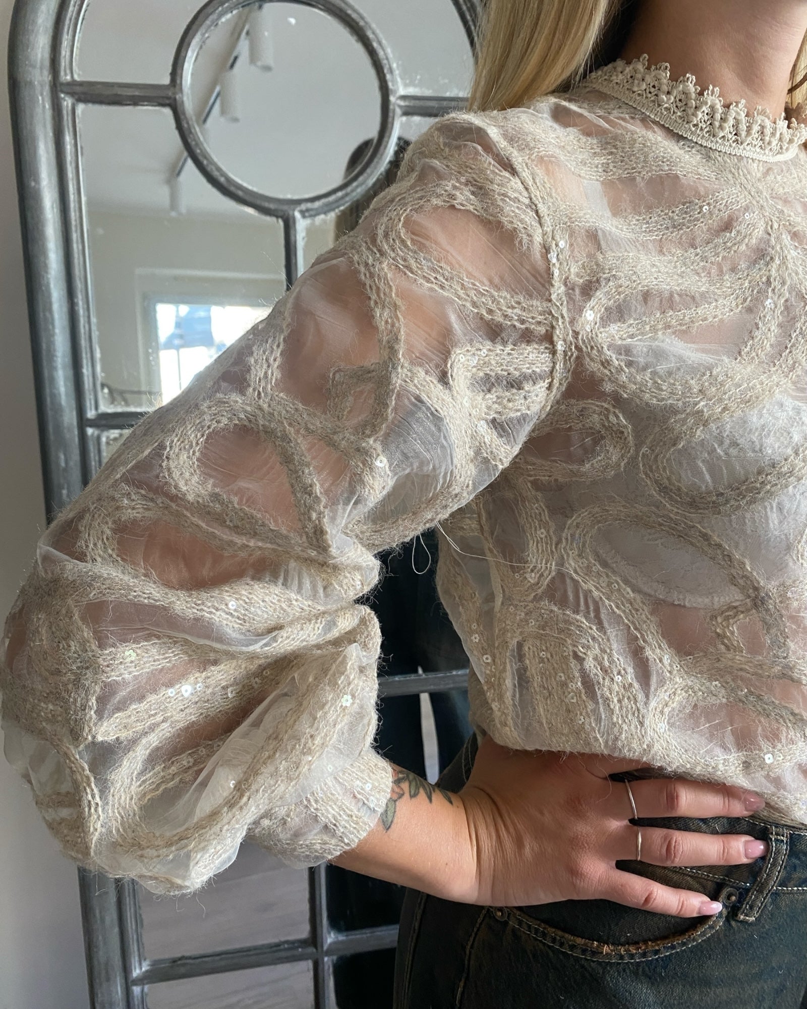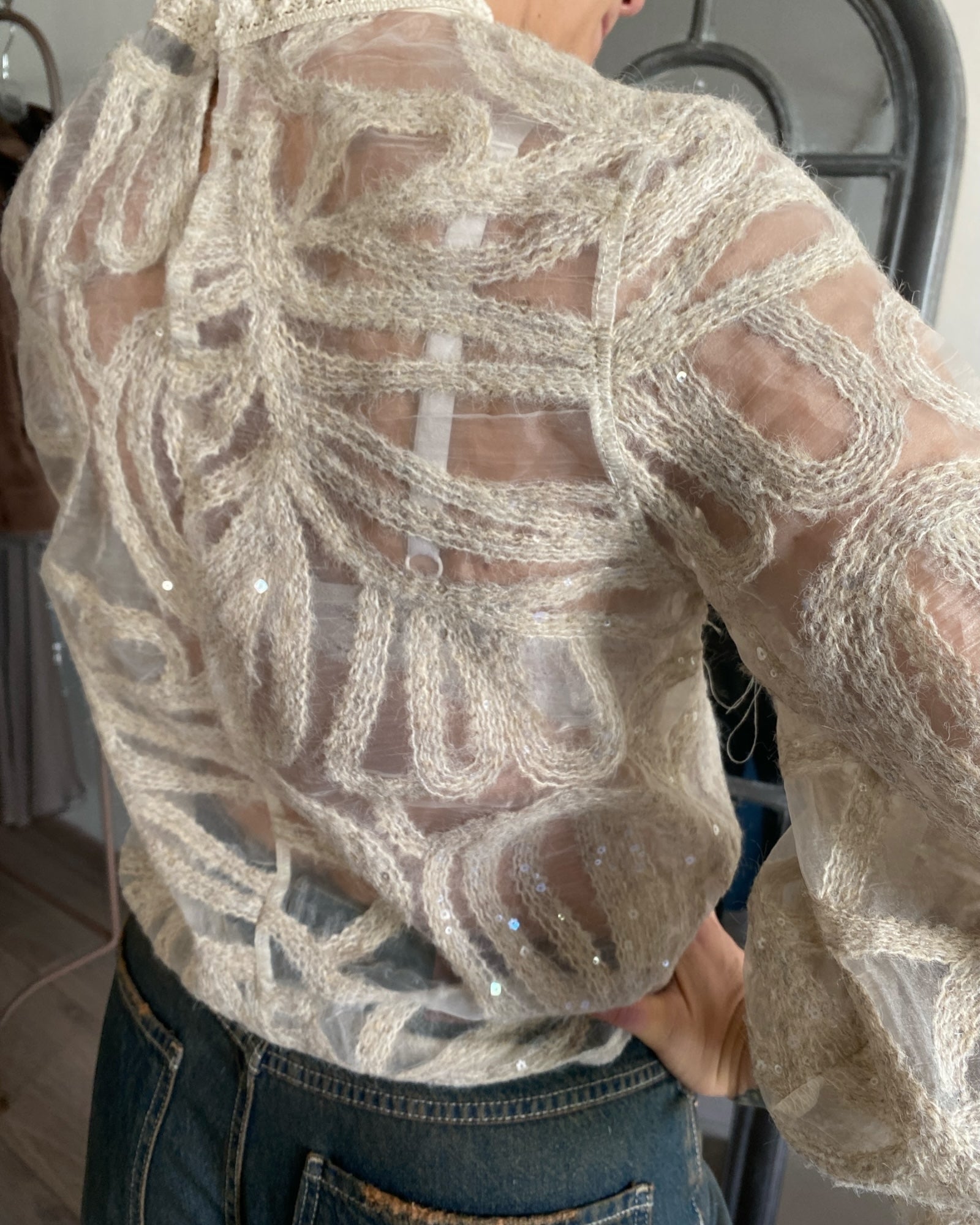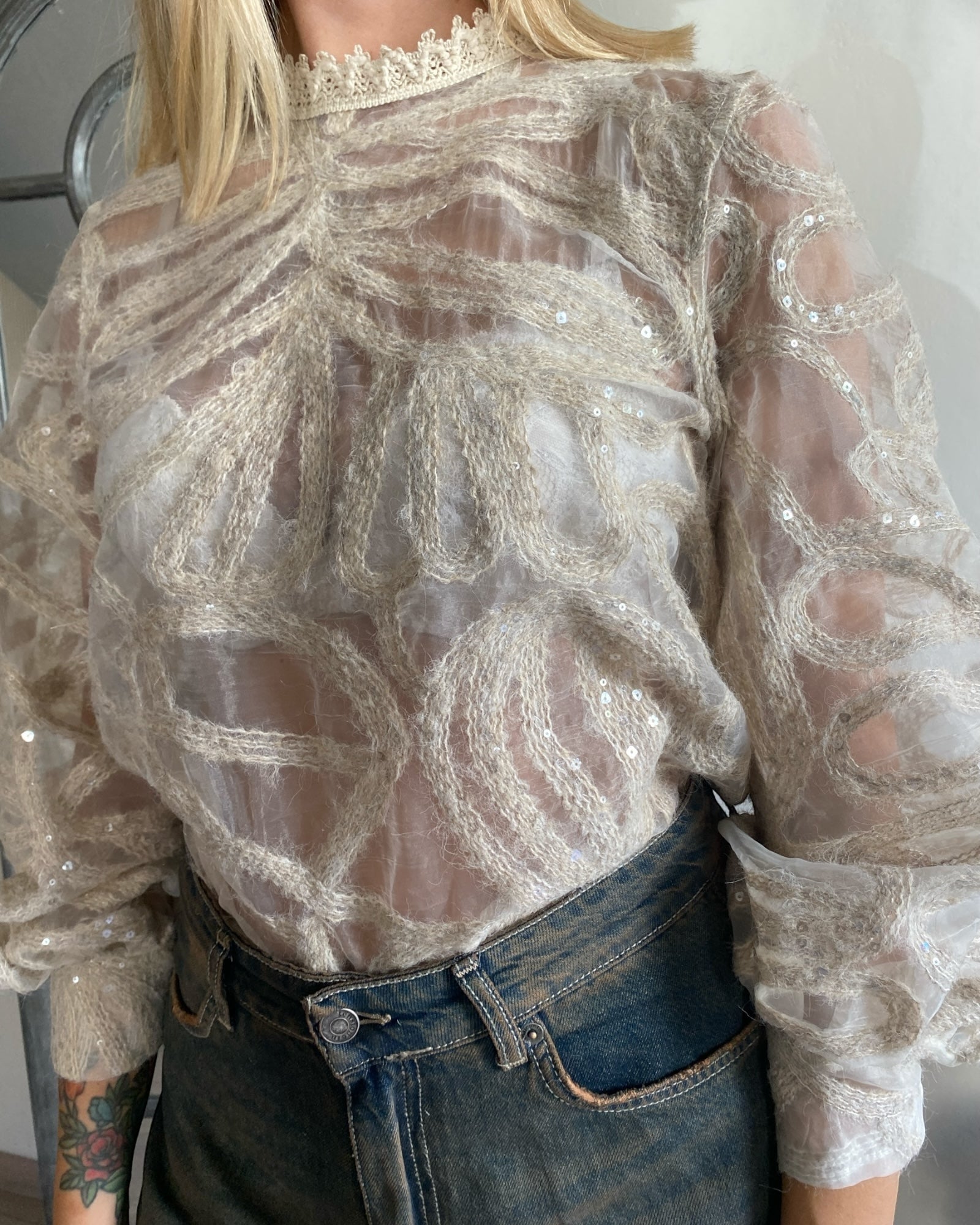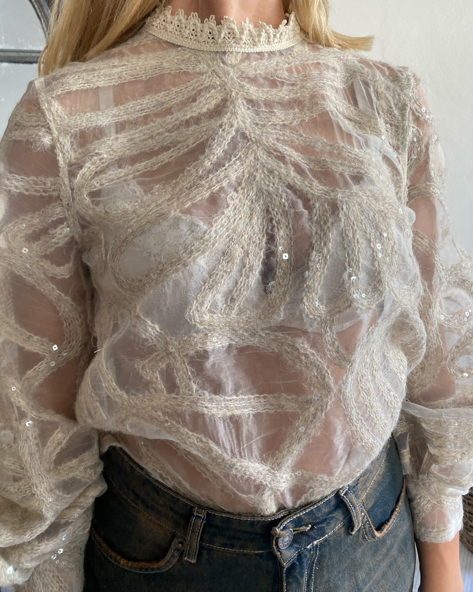 Blusa velata impreziosita da ricami e paillettes, con collo in pizzo raffinato, perfetta per outfit eleganti e di carattere. Design sofisticato che unisce trasparenza e dettagli dallo stile artigianale.