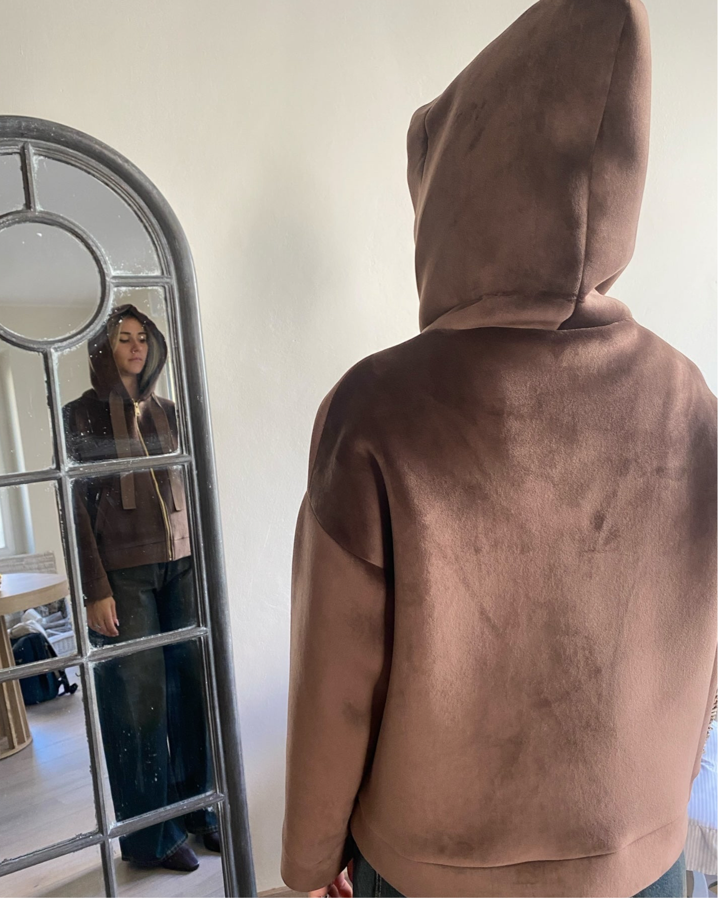 Bomber con cappuccio in morbido effetto velluto, caratterizzato da una linea casual ma sofisticata.