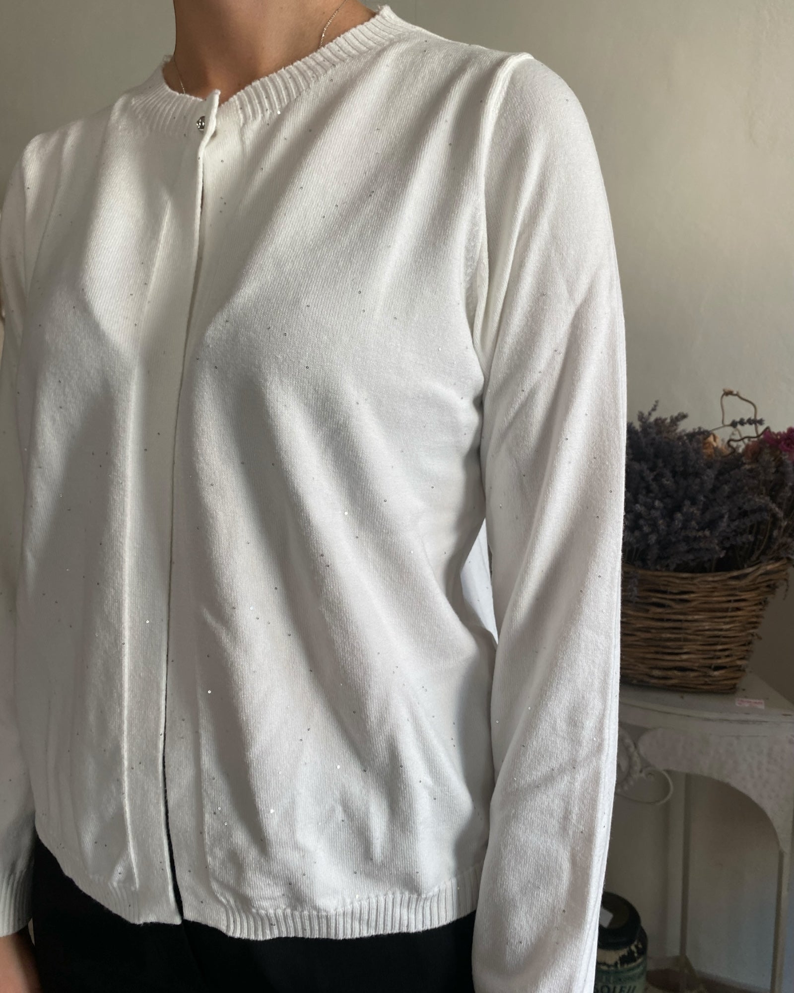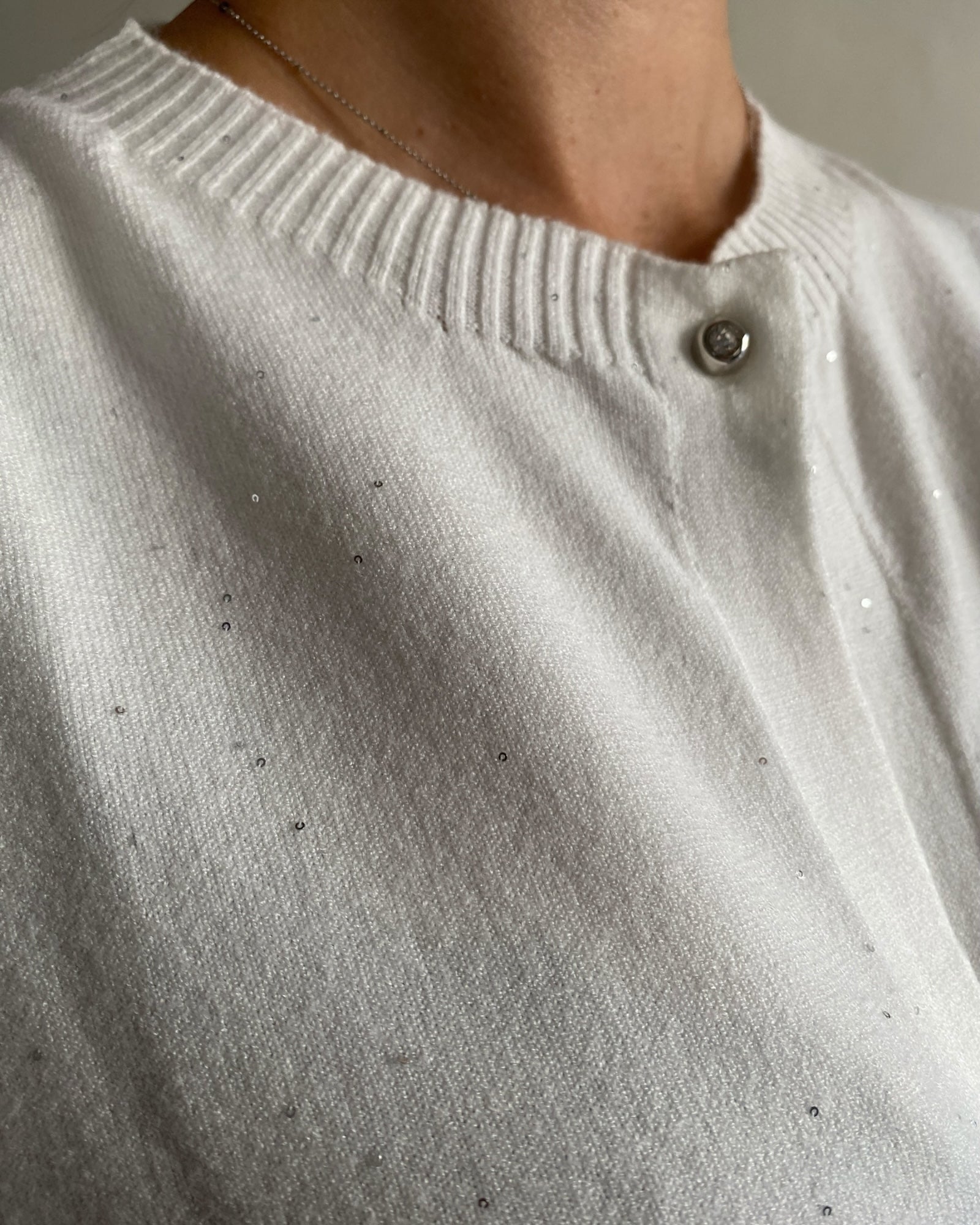 Cardigan corto impreziosito da micro paillettes che dona un raffinato effetto brillante, perfetto per arricchire con eleganza ogni outfit. Realizzato con cura per assicurare comfort e stile in ogni occasione.