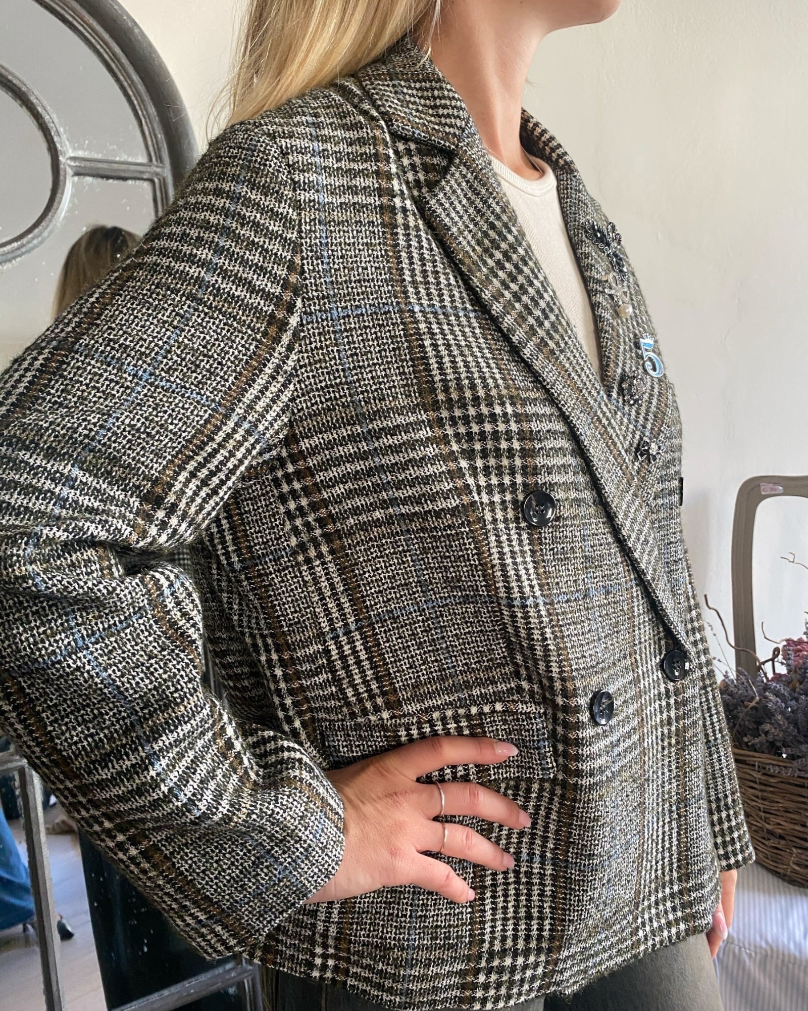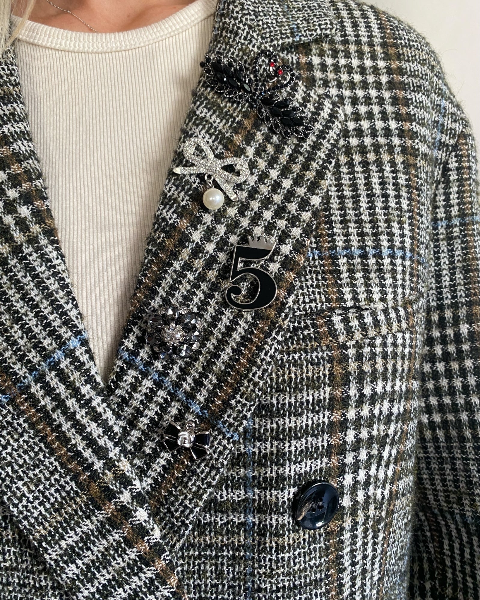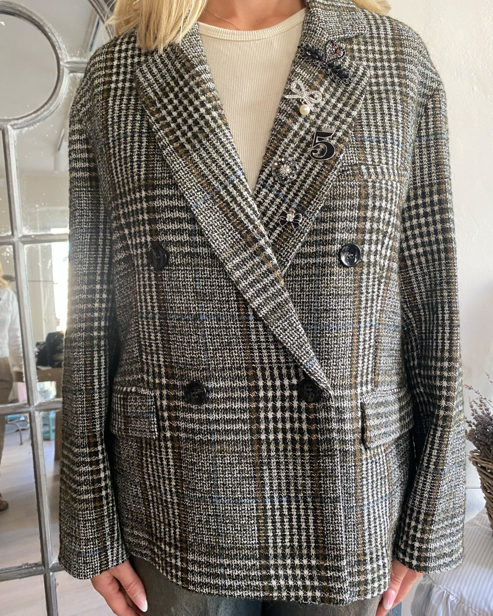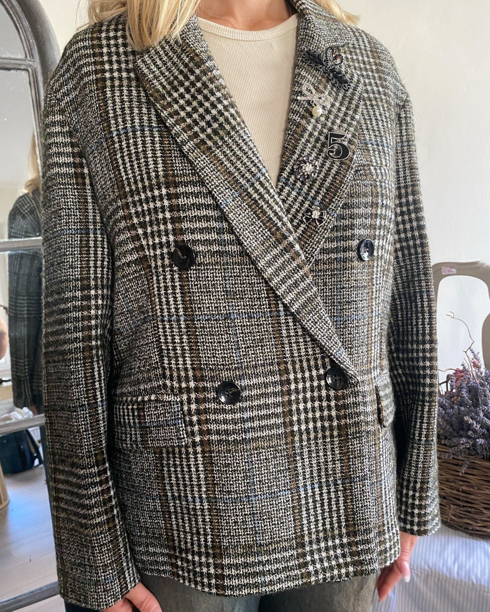 Giacca doppiopetto dalla linea moderna, arricchita da spille decorative che ne esaltano lo stile unico.