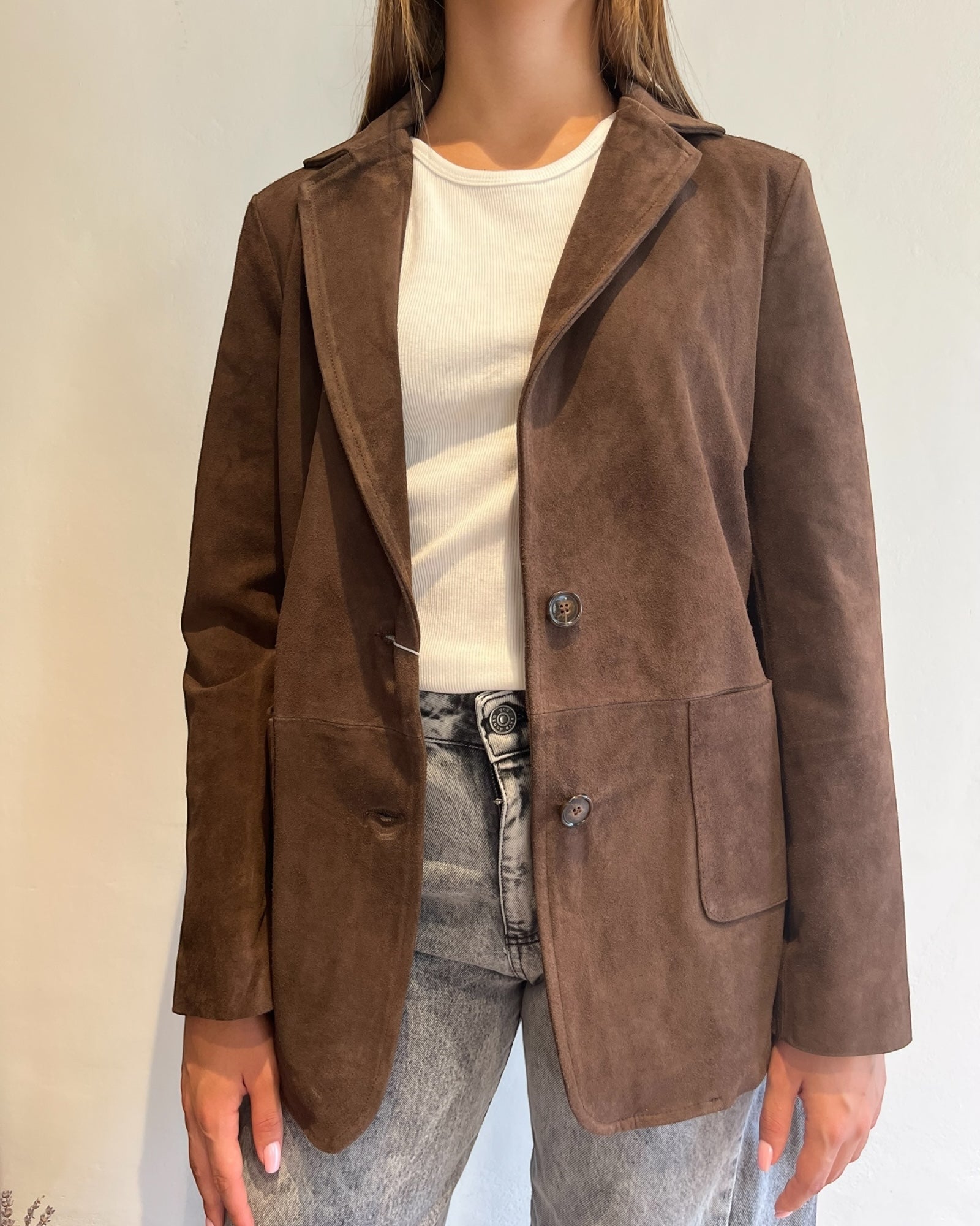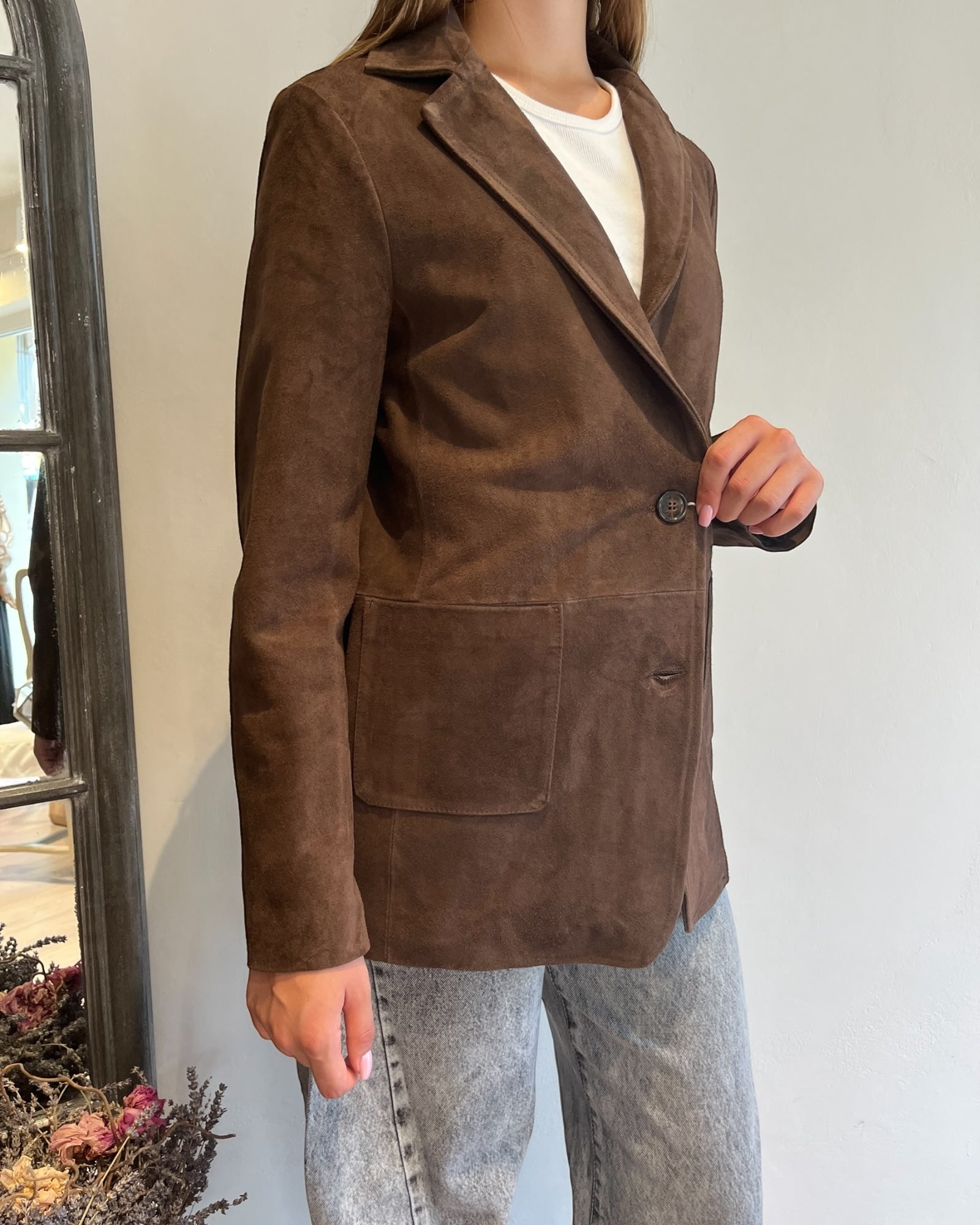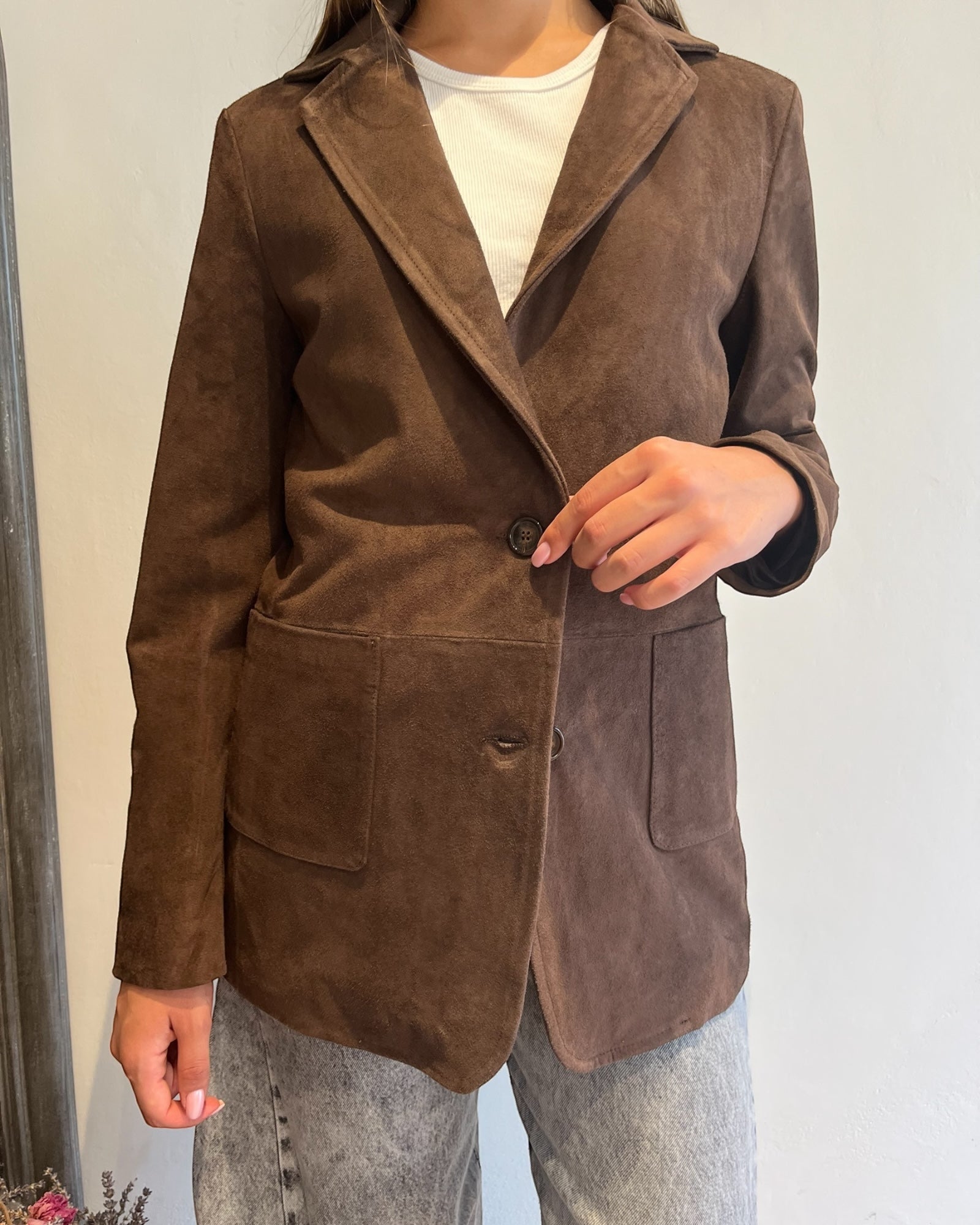 Giacca in vera pelle effetto camoscio con tasche ampie e linea dritta.