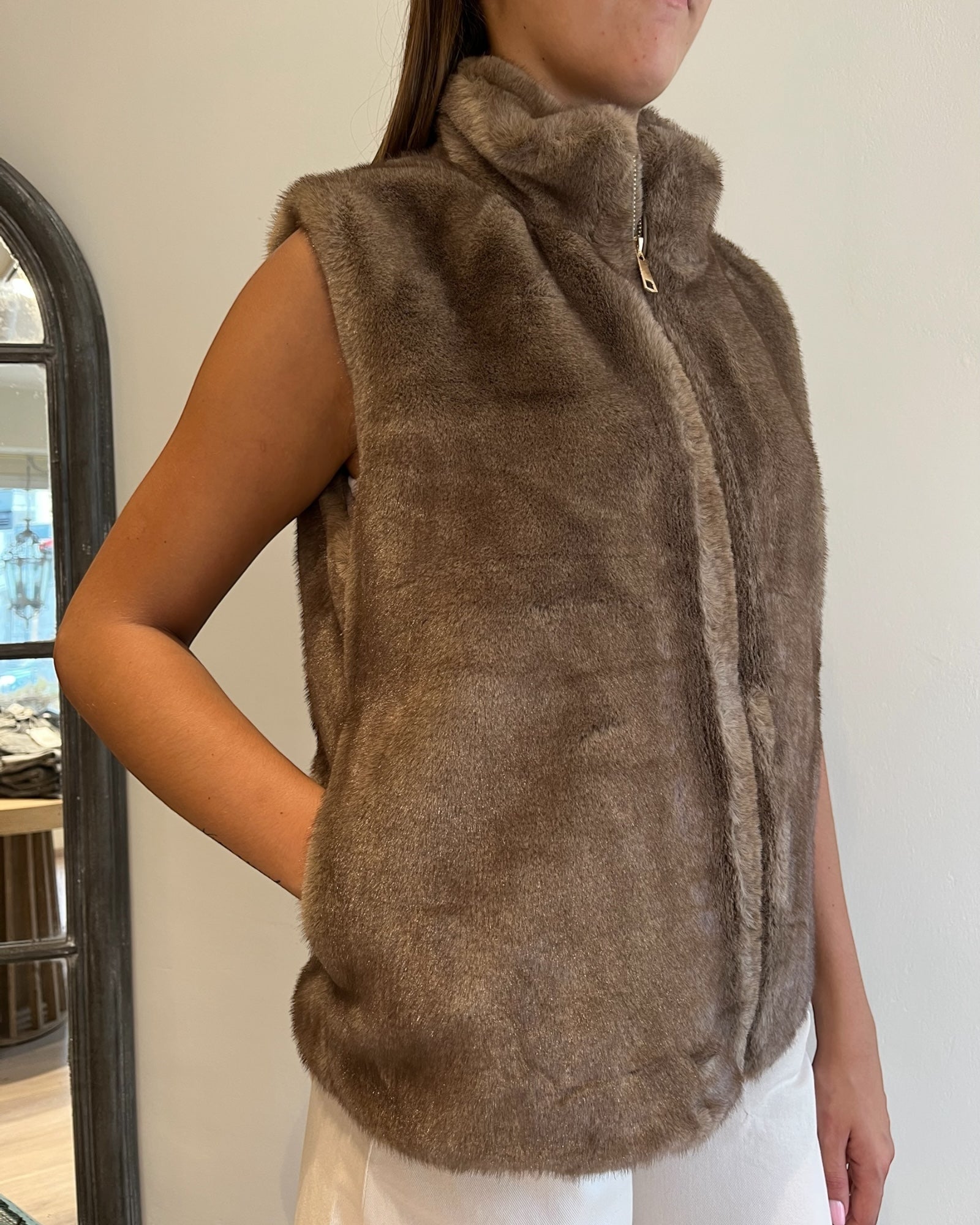 Gilet in ecopelliccia con zip frontale e collo alto dal taglio minimale.