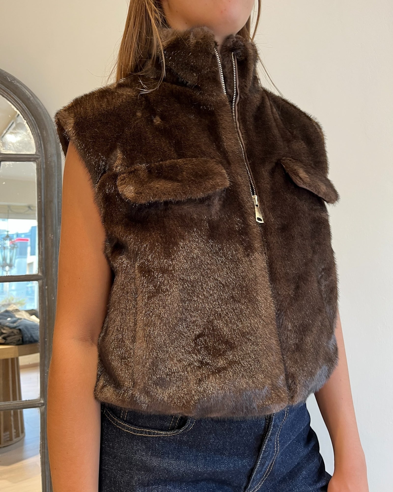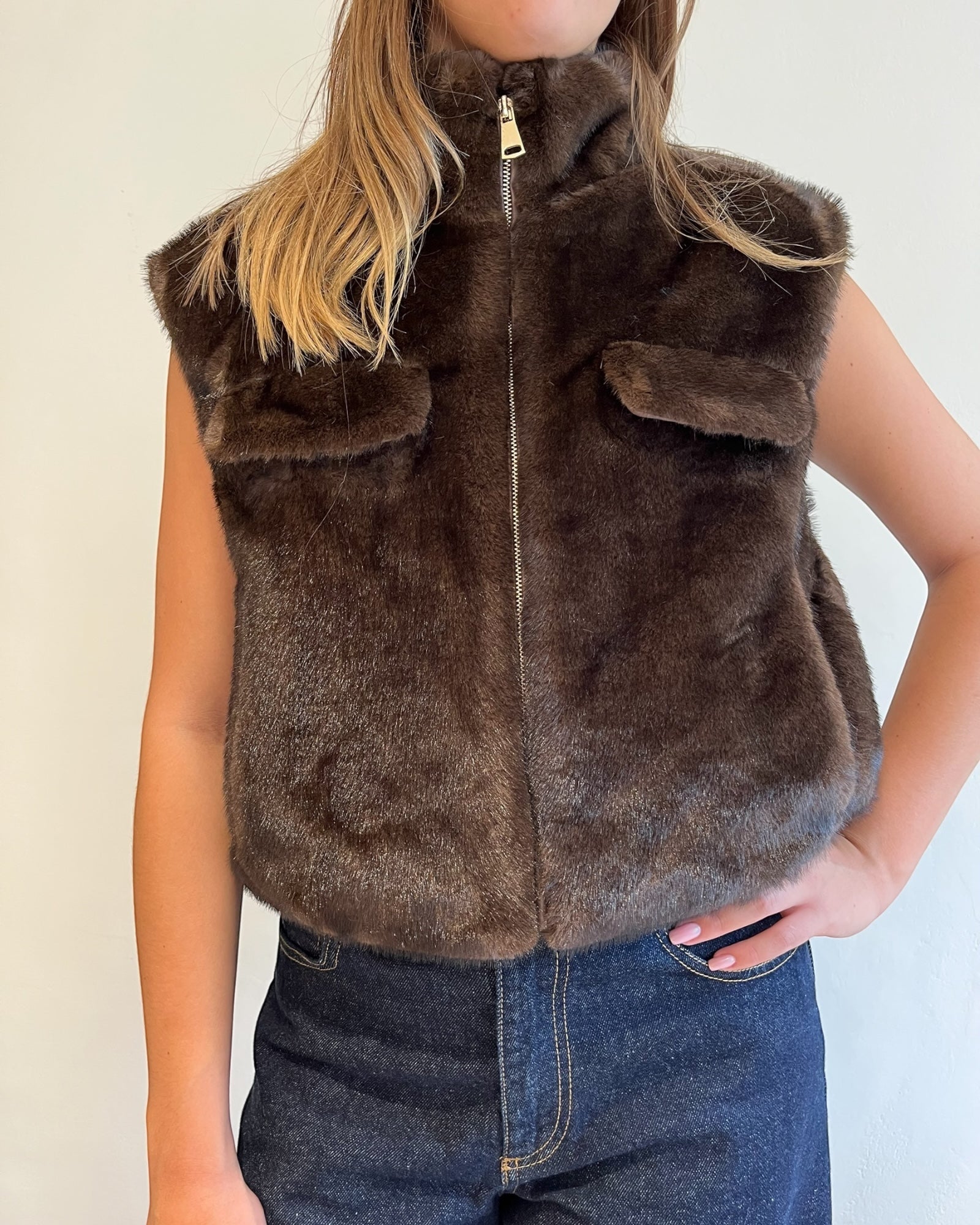 Gilet in ecopelliccia con collo alto, zip frontale e taschini applicati.