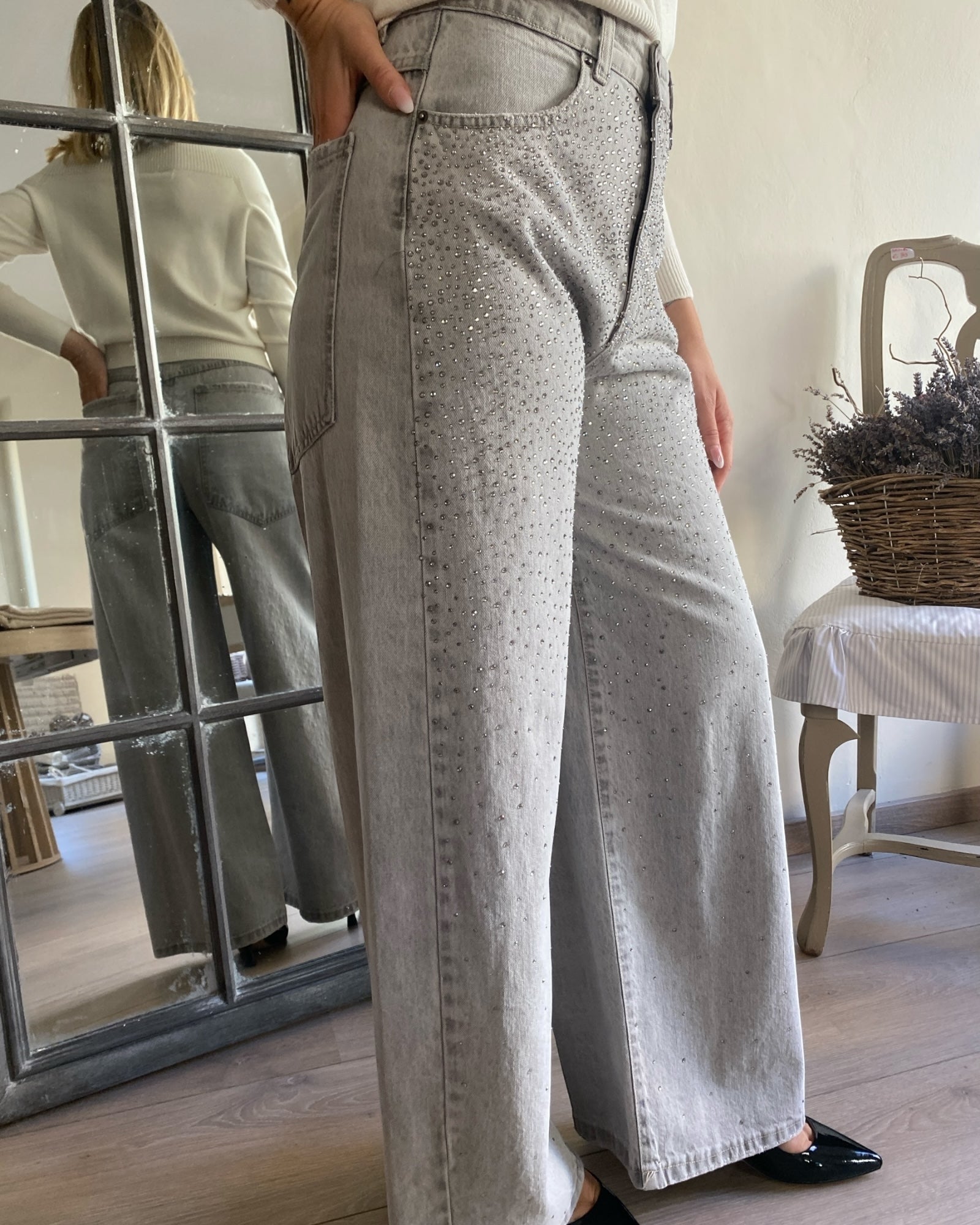 Jeans dal design moderno con tasche oversize decorate da strass, per un tocco elegante e distintivo. Realizzati con materiali di qualità per comfort e durata nel tempo.