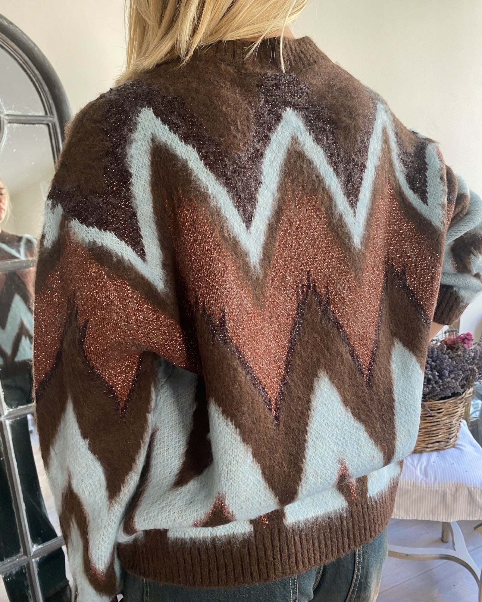 Maglione girocollo in morbido tessuto con stampa multicolor, ideale per aggiungere un tocco di vivacità a qualsiasi look casual. Design versatile che unisce comfort e stile contemporaneo.