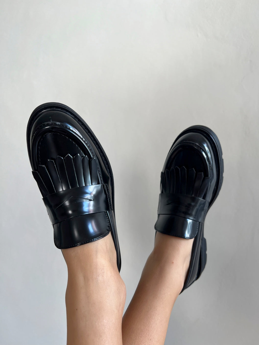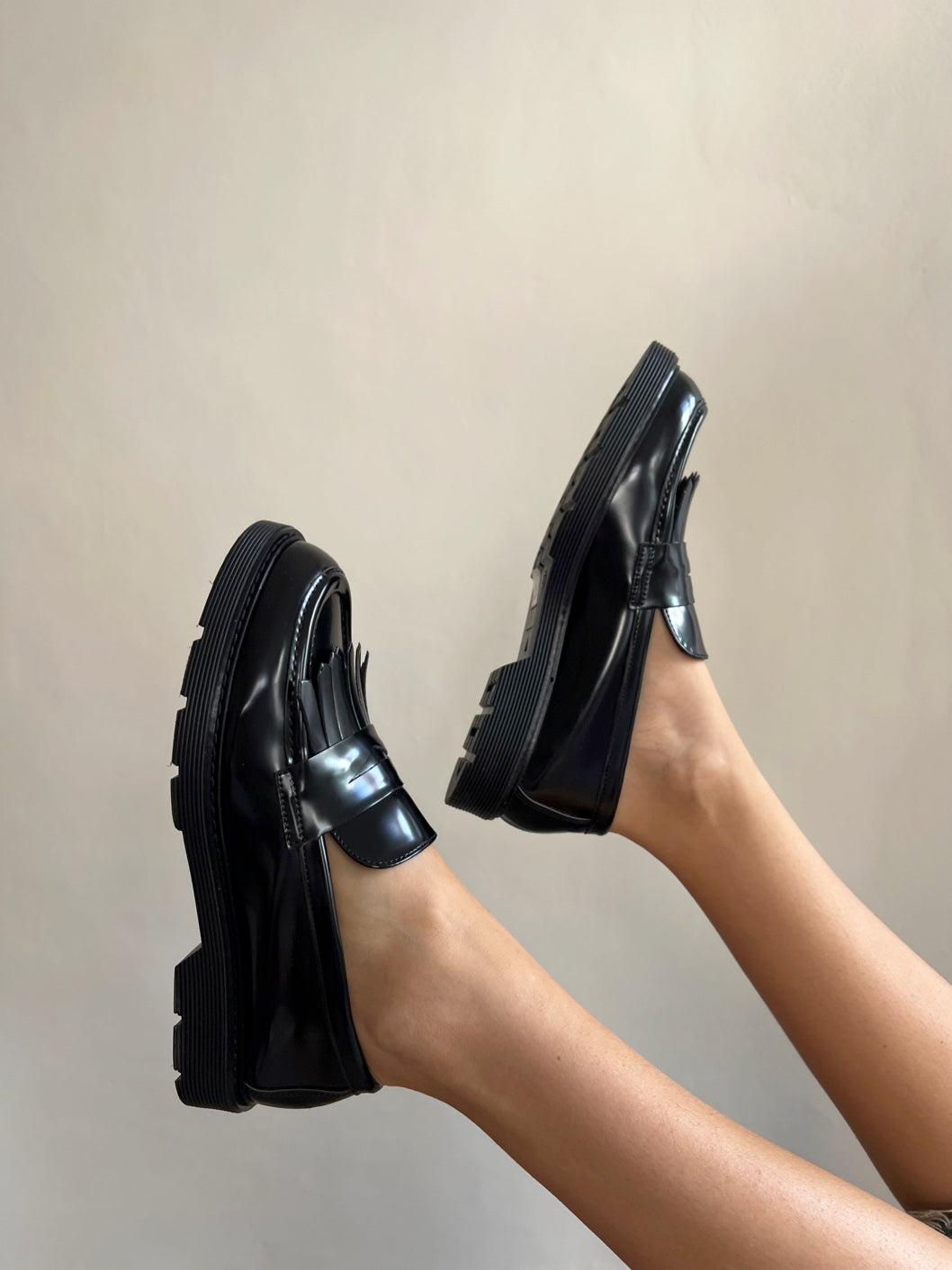 Mocassini moderni con finitura lucida, suola spessa e dettagli frangiati.