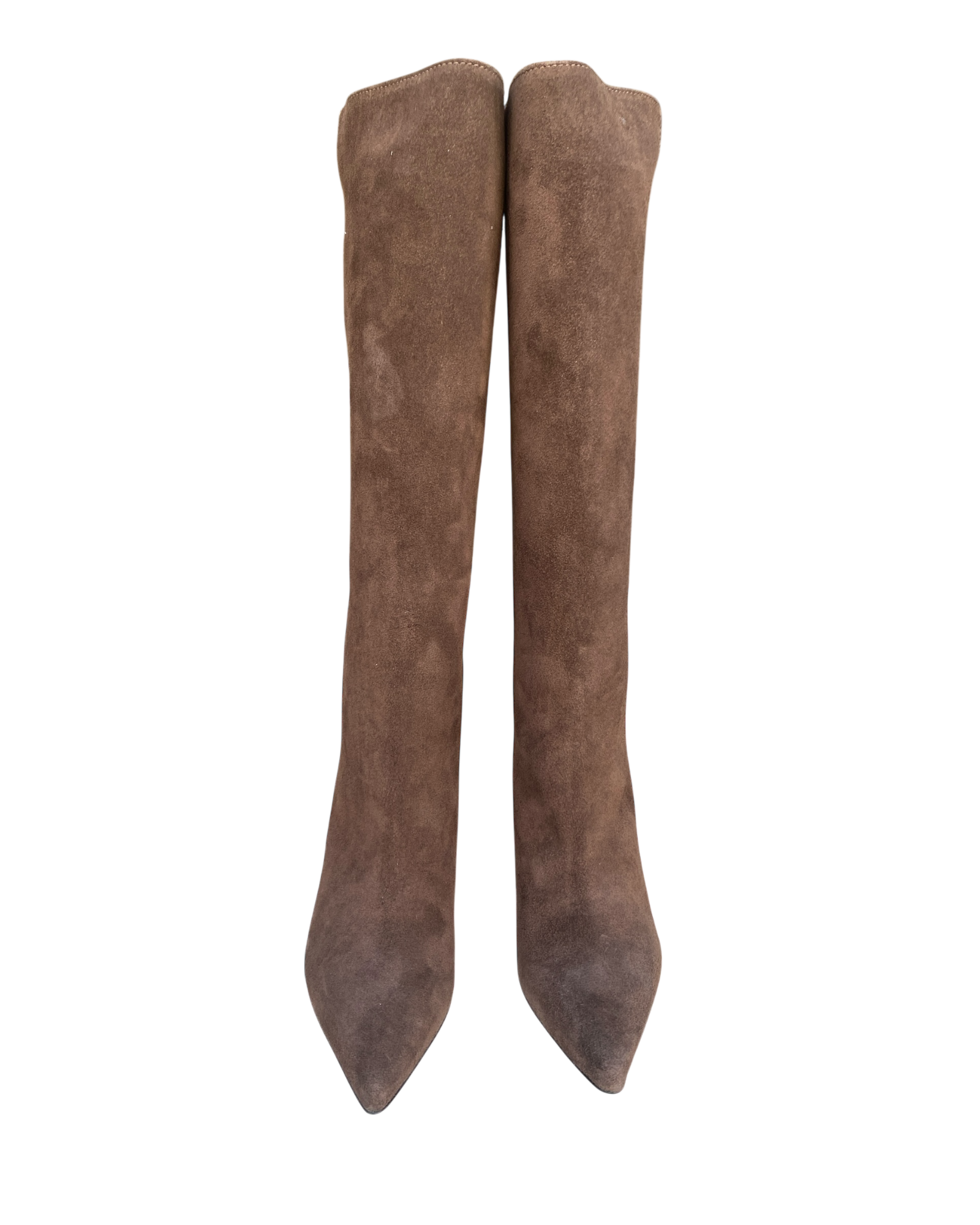 Stivale a punta con linea essenziale e tacco sottile che slancia la figura.