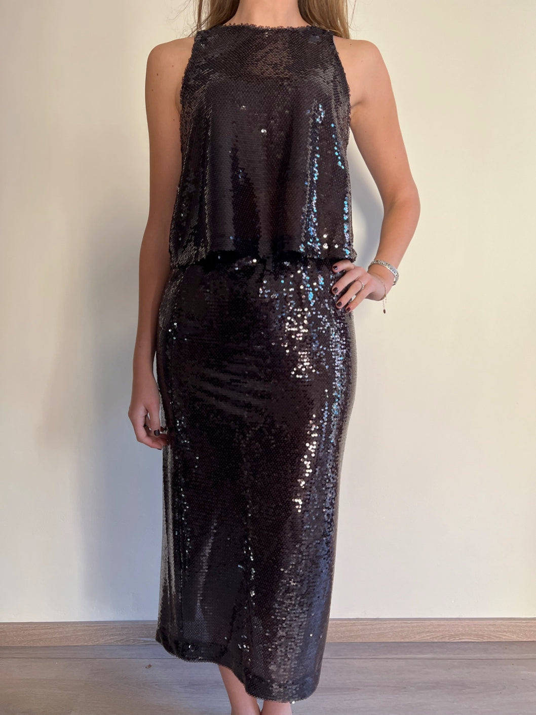 Top smanicato in tessuto interamente ricoperto di paillettes scure, caratterizzato da un taglio leggermente morbido. Ideale da abbinare alla sua gonna, per look serali eleganti e scintillanti.